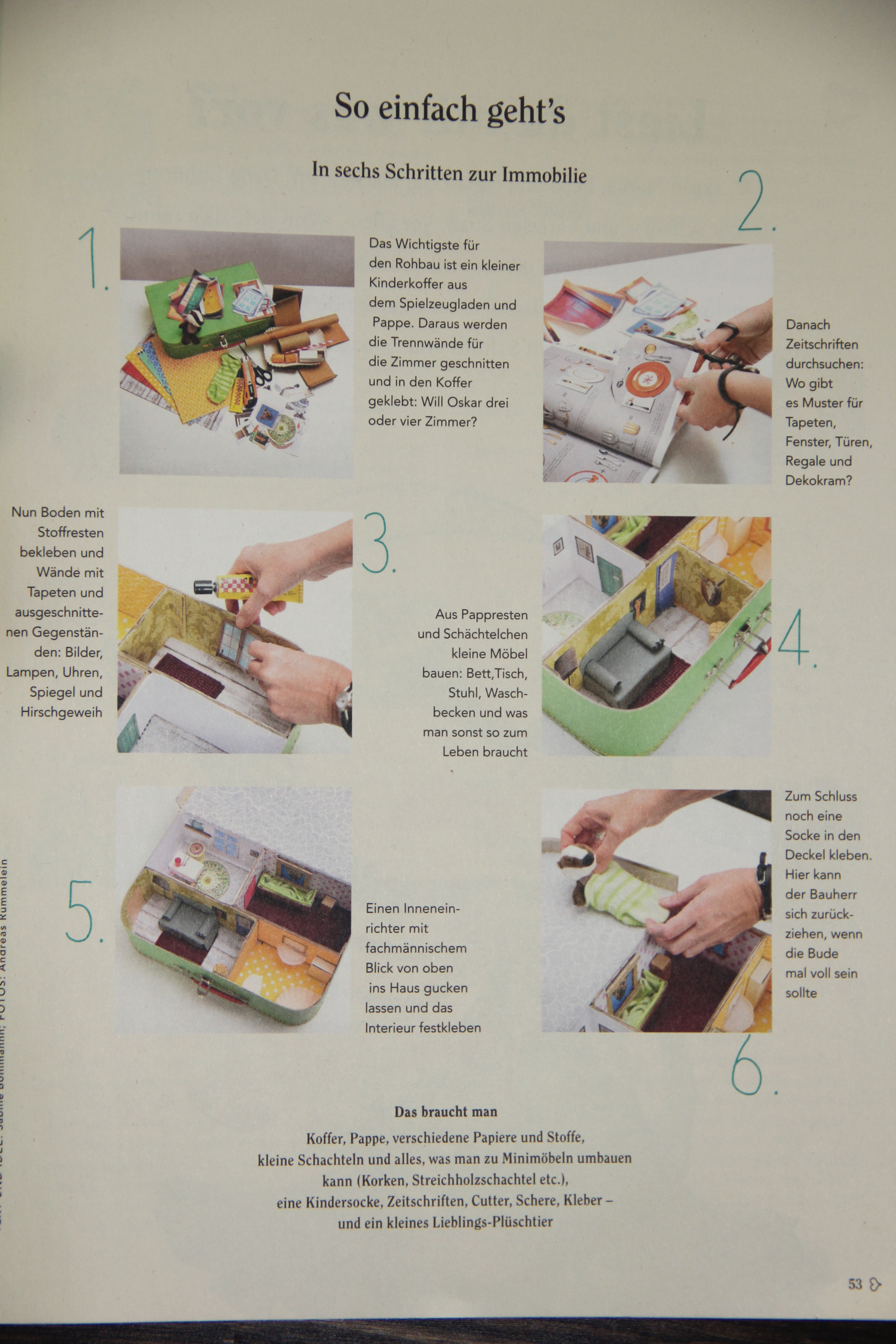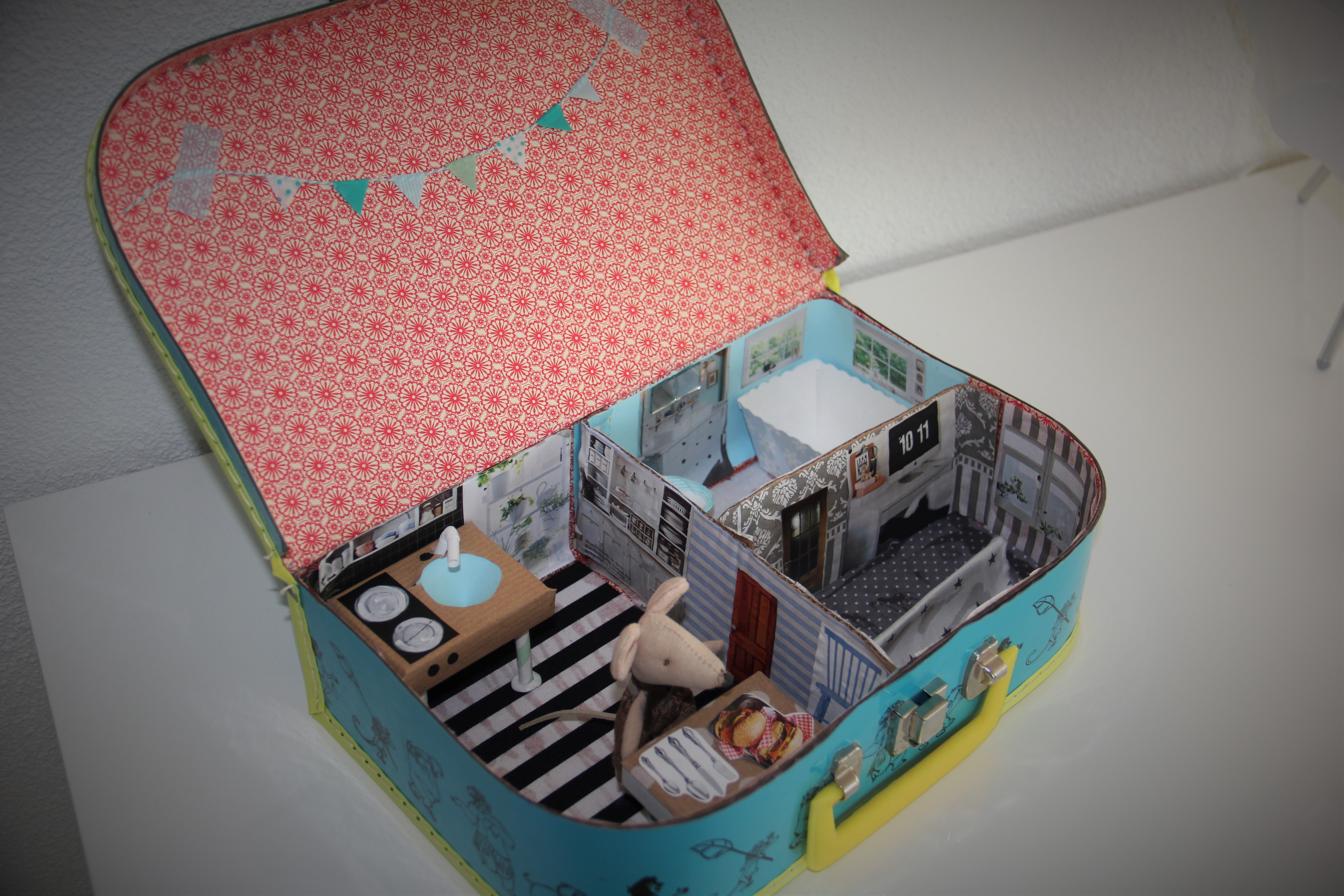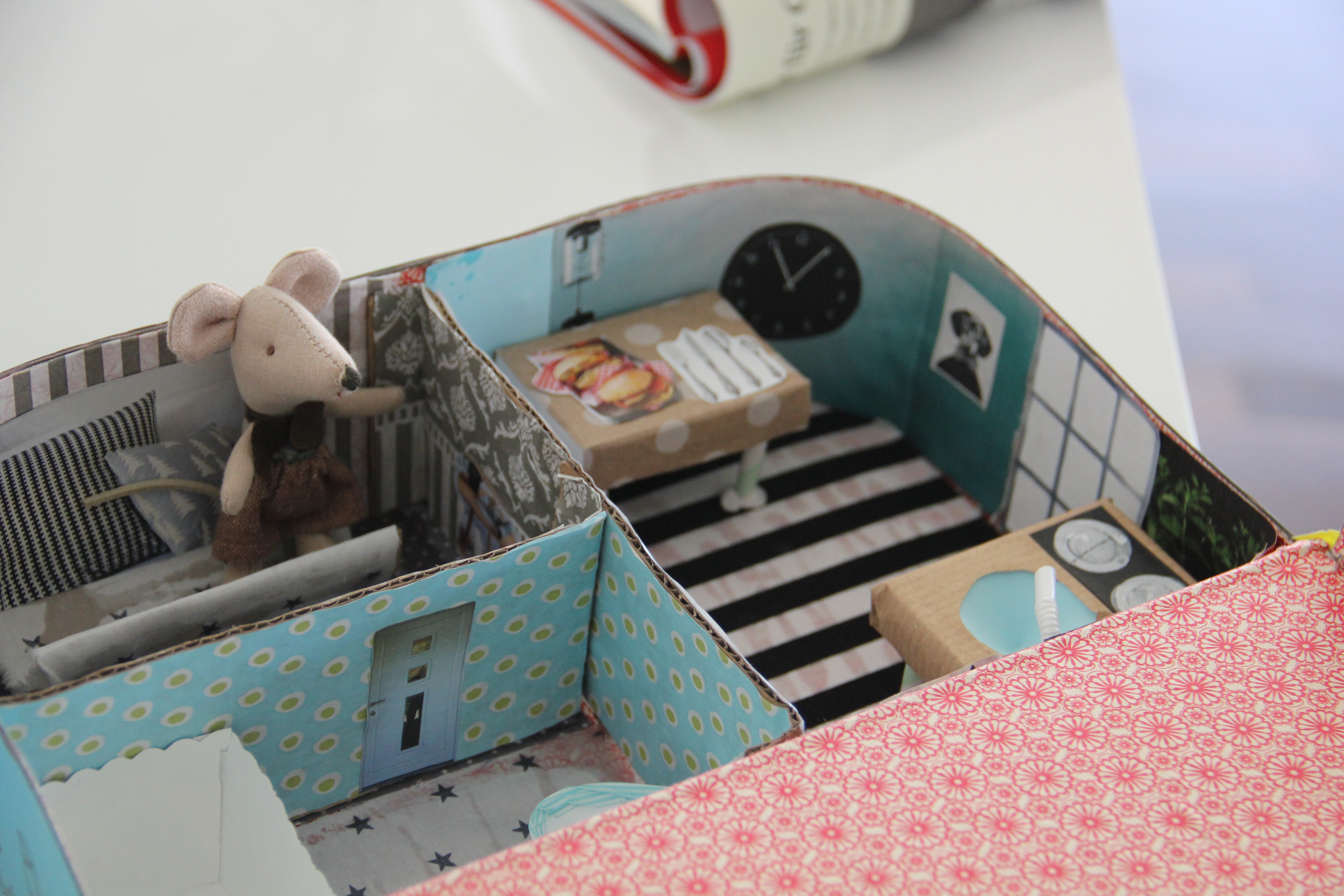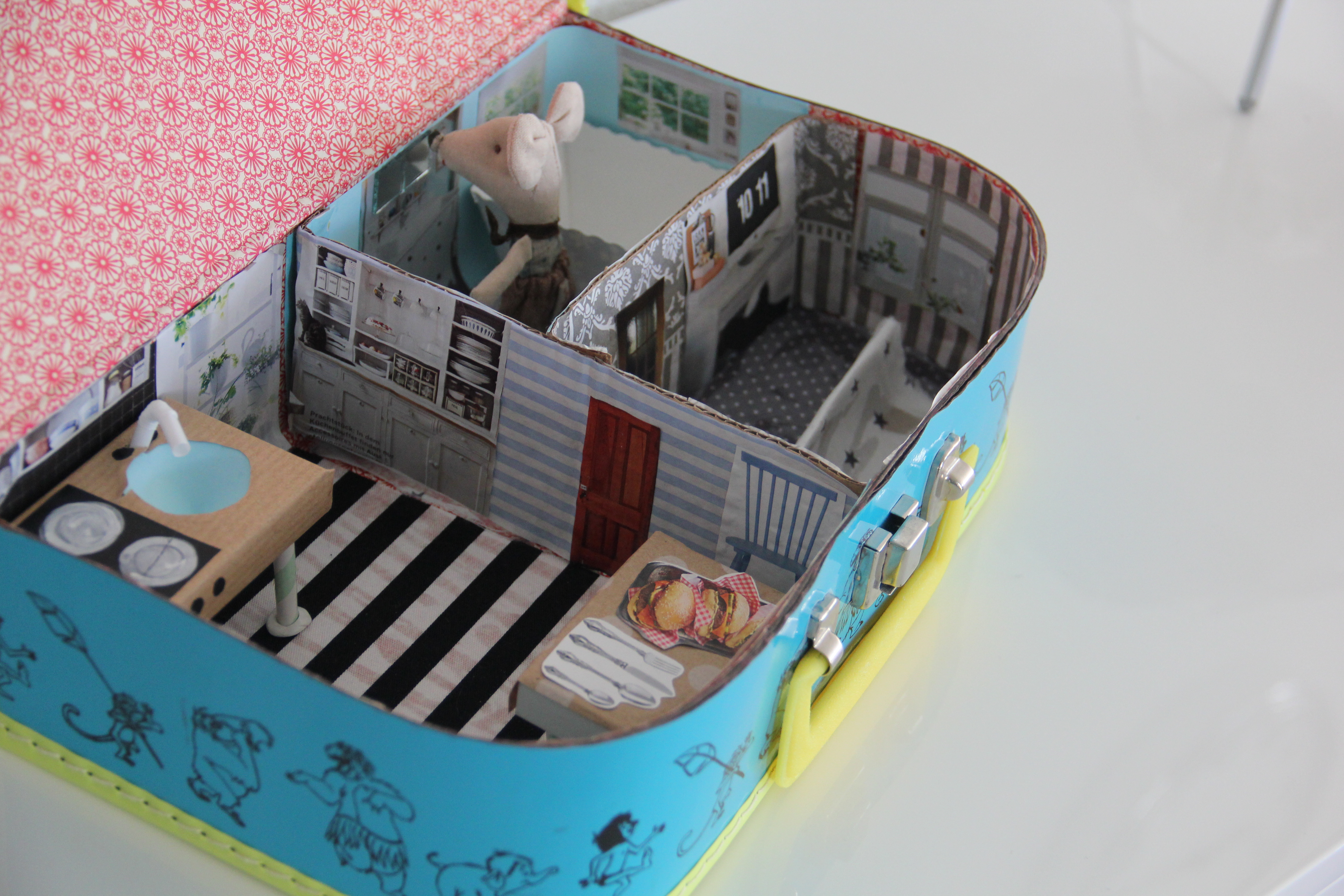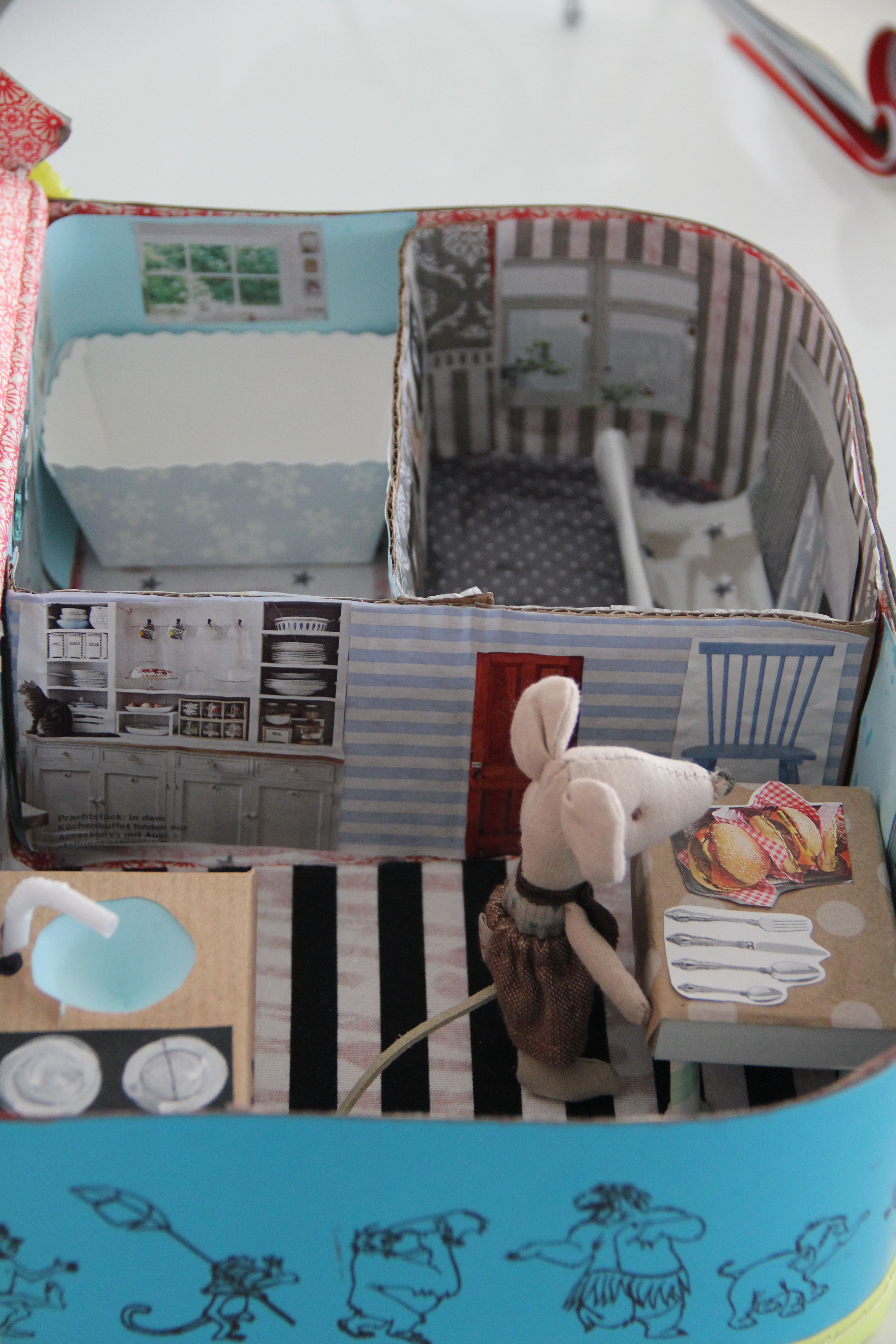 Aber ich schweife ab. Also wieder zurück zum Anfang. Nach zwischenzeitlichen Schluchzern, stiess ich schlussendlich auf die Bastel-Rubrik. Gleich sprang mir das 5-Sterne-Haus für Oskar ins Auge. Oskar der Dachs bekam ein Köfferchenhaus. Mein Herz jubelte. Ich baute schon als ganz kleines Mädchen in beinahe jedem freien Schlupfloch im Wald kleine Wohnungen aus Moos und Ästen für meinen Bewohner namens Baski. Der Fantasie waren keine Grenzen gesetzt. Dies zog sich dann weiter. Aus Pappkartons wurden auf einmal Mäuse-Auffangstationen. Aus Zündholzschächtelchen klitzekleine Apartments für irgendwelche Bewohner. Die ganze Palette weiss ich jetzt natürlich nicht mehr. Fest steht, ich wollte auch so ein Häuschen für meinen Sohn Henrik basteln. Da musste doch noch solch ein Köfferchen auf dem Dachboden meiner Eltern rumstehen, das irgendwelchen Krimskrams von dem ich mich nicht trennen konnte, hütete. Und da war es tatsächlich, mein Dschungelbuch-Köfferchen, mit dem ich meiner Mutter ein paar Mal nach einem Streit mit dem Auszug meinerseits drohte. So ich geh jetzt, tschüss Mami. Wird echt Henrik dieses Köfferchen auch mal als Druckmittel gegen mich verwenden? Haha wir werden sehen. Ein Gspänli hätte er ja bereits dabei. Denn bei uns ist der zuckersüsse Mäuserich namens Frederick eingezogen. Das Mäuschen war ein Geschenk von der lieben Melanie vom unglaublich tollen Online-Shop und Lädeli „Bella Casa„. Ein Besuch im Lädeli ist ganz weit oben auf meiner Prioritäten-Liste. Denn dieses befindet sich in Niederlenz, unserem neuen Wohnkanton, und ist nur ein Katzensprung von unserem Zuhause entfernt. Also hoffentlich bis bald liebe Melanie und nochmals vielen herzlichen Dank! Für die Bodenbeläge benötigte man Stoffreste. Da ich nicht nähe, Fehlanzeige. Da half mir doch glatt meine liebe Freundin Manuela aus und sandte mir diverse Stoffreste aus ihrer Sammlung. Vielen lieben Dank auch an dich! Zeitschriften wurden durchstöbert, es wurde wild ausgeschnitten, gebastelt und geklebt. Ich habe unserem Frederick drei schicke Räume gezimmert. Aus Streichholzschächtelchen wurden Esstisch und Kochnische mit Spülbecken und Herdplatten. Aus „WC-Rölleli“ wurde ein Sofa, das über Nacht als Bett fungiert. Aus einer kleinen Cake-Form wurde eine Badewanne. Aus einem Plastiklöffel das stille Örtchen. Als Badezimmer-Spiegel wurden spiegelnde Mosaik-Steinchen übers Lavabo geklebt. Ein Stuhl bekommt der kleine Frederick vielleicht auch mal noch. Im Moment ist er allem Anschein nach mit seinem Burger-Steh-Lunch sehr zufrieden. Der kleine Tiger ist ja sowieso noch zu klein für die Köfferchen-Immobilie. Würde er doch glatt die ganze Bude zum Einstürzen bringen und jedes Teilchen in den Mund schieben. Auweia. Aber am Maileg-Mäuschen Frederick hat er schon jetzt eine grosse Freude und wer weiss, vielleicht kann ich das Köfferchen ja glatt mal unter das nächste oder übernächste Weihnachtsbäumchen schmuggeln.
