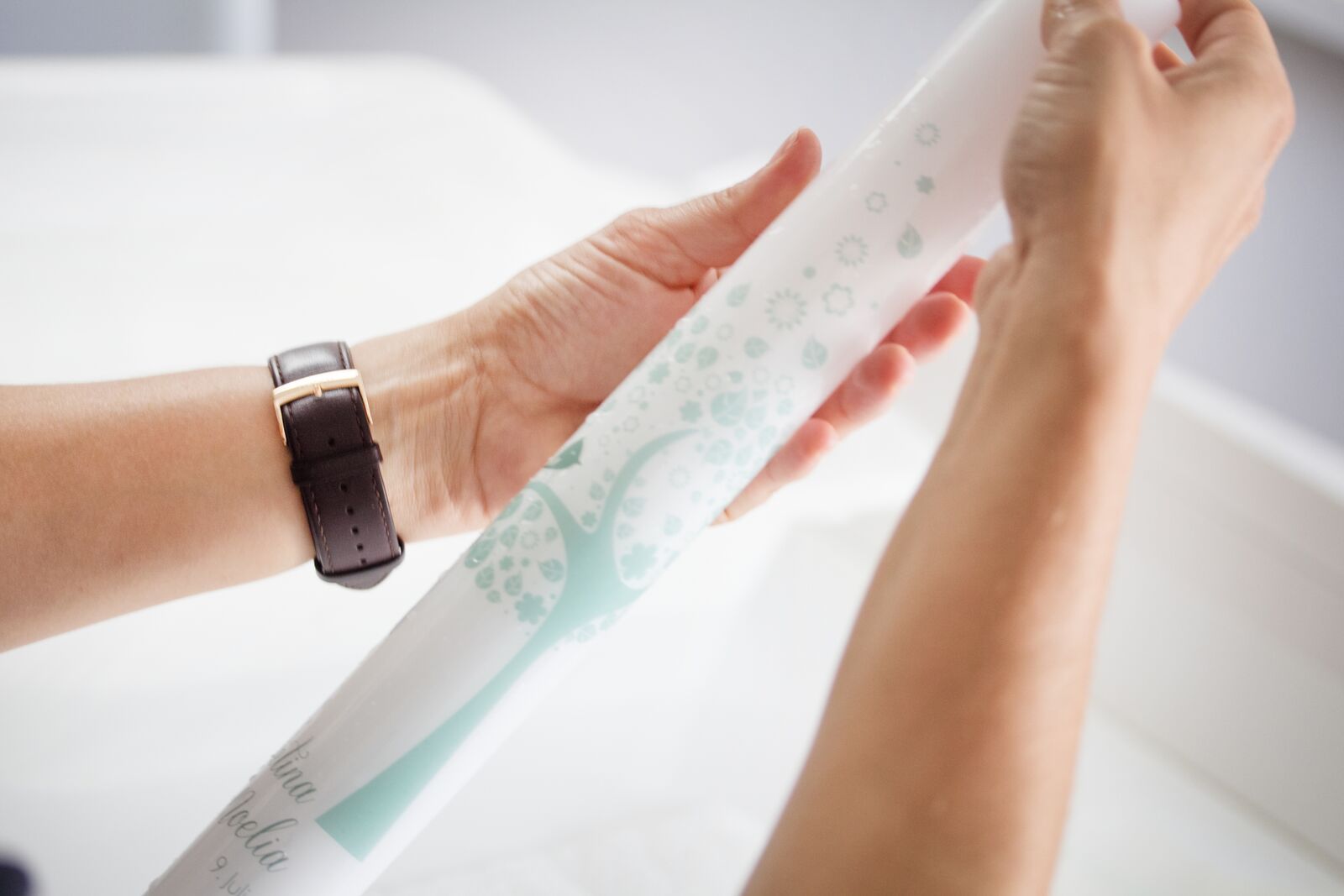 Im Unterschied zur herkömmlichen Taufkerze mit Wachsdekoration wird hier das gewünschte Design per Digitaldruck auf Folie gedruckt und ermöglicht somit unzählige Farb- und Sujetmöglichkeiten. Die Folie wird dann von den beiden Freundinnen und Geschäftspartnerinnen in Handarbeit auf die Kerze aufgetragen.